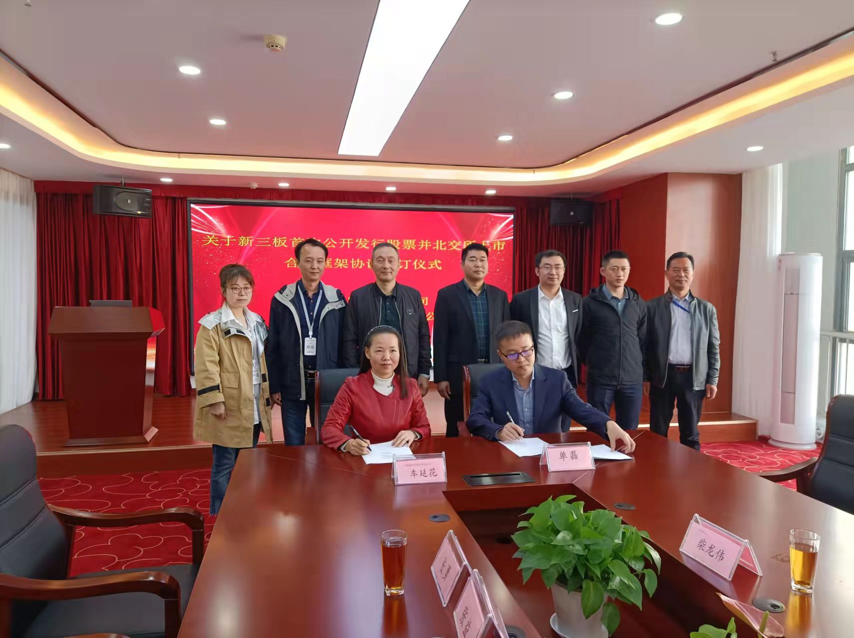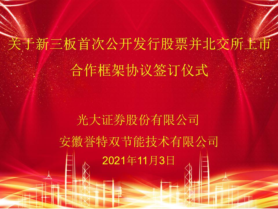 2021年11月3日上午,我公司與光大證券舉行“新三板首次公開發(fā)行股票并北交所上市合作框架協(xié)議”簽約儀式,參加儀式的有光大證券投資銀行部高級總裁保代單磊、蕪湖營業(yè)部總經(jīng)理晉偉、園區(qū)黨委副書記、副總經(jīng)理張勇、汪任保、科創(chuàng)投資公司總經(jīng)理張益、招才引智辦主任柴龍偉、招商部部長周麗萍、公司董事長車延花、總經(jīng)理袁克等相關(guān)領(lǐng)導(dǎo)。