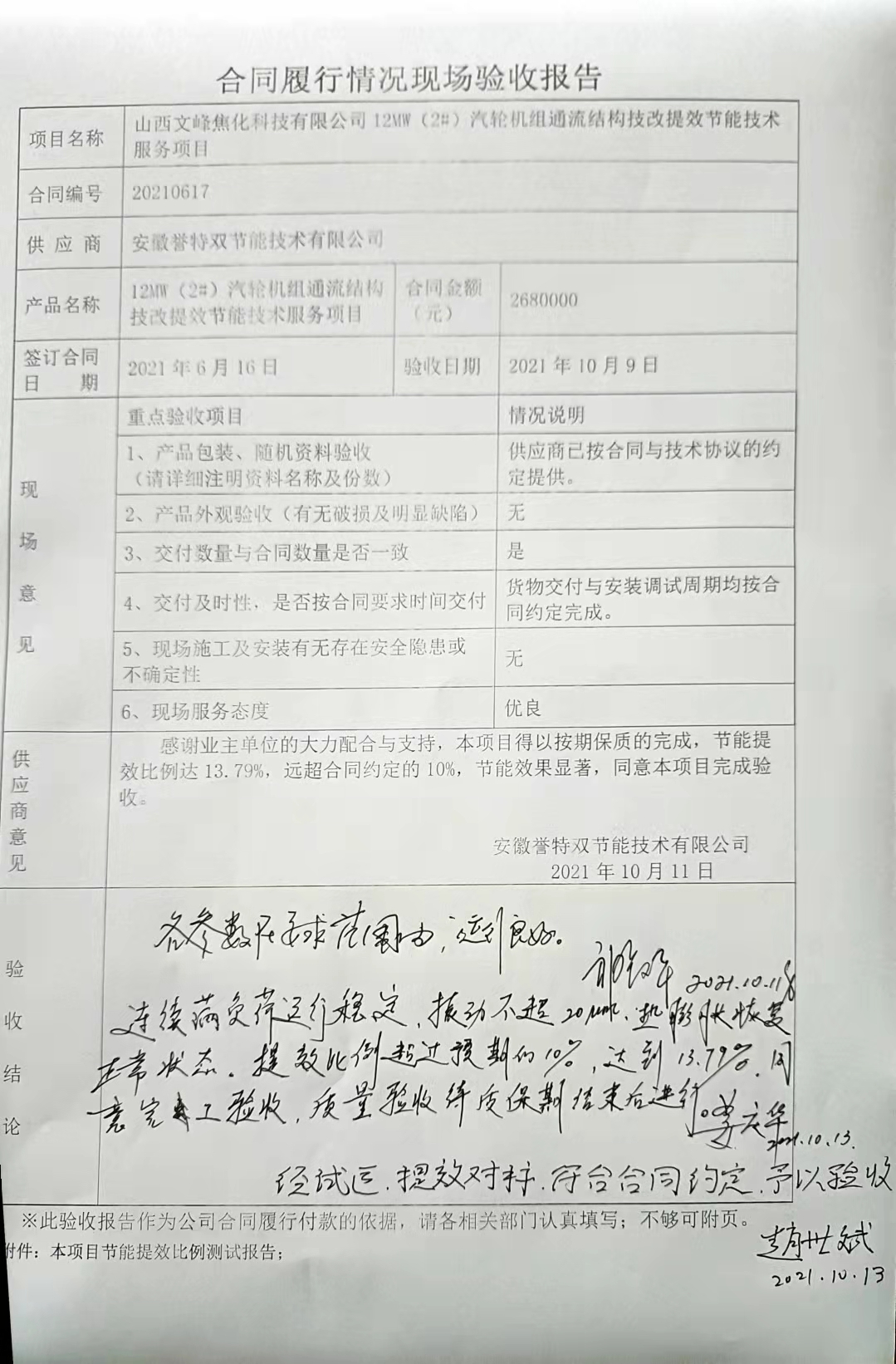 2021年10月13日,我公司技術(shù)服務(wù)項目——山西汾陽焦化12MW汽輪機(jī)組通流改造節(jié)能提效項目順利通過工程驗收,節(jié)能提效比例達(dá)13.79%,遠(yuǎn)超合同約定的10%考核指標(biāo),在此表示熱烈祝賀。