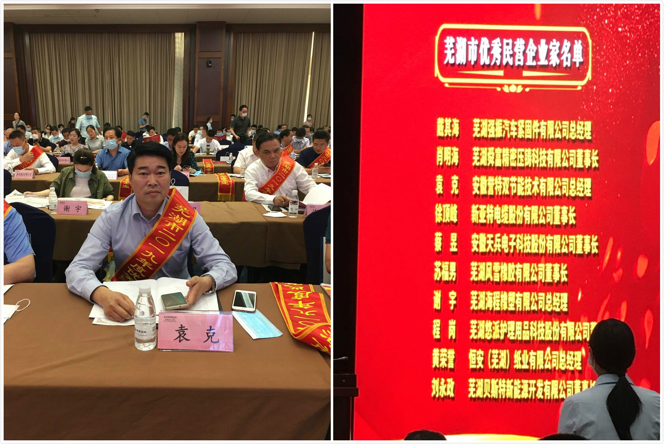2020年5月21日,我公司總經(jīng)理袁克同志,獲評2019年蕪湖市優(yōu)秀民營企業(yè)家榮譽稱號,在蕪湖海螺國際大酒店舉行的頒獎典禮上,由市委書記潘朝輝同志,親自授予榮譽證書和獎牌。