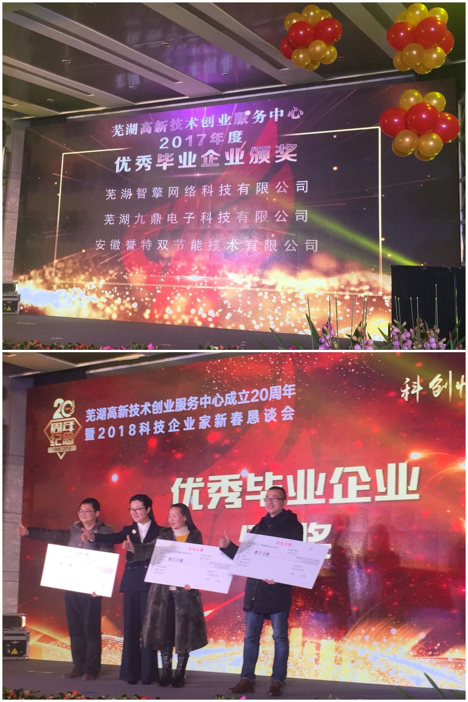 近日,我公司安徽譽(yù)特雙節(jié)能技術(shù)有限公司,榮獲蕪湖市國(guó)家級(jí)高新技術(shù)創(chuàng)業(yè)園區(qū)“2017年優(yōu)秀畢業(yè)創(chuàng)業(yè)企業(yè)”榮譽(yù)稱(chēng)號(hào)。