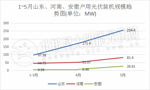 從整體來(lái)看,戶用市場(chǎng)已經(jīng)回暖,以山東、河南、安徽等為代表的省份裝機(jī)規(guī)模直線上升,其中,山東上升幅度較大,1-3月新增97.58MW,4月新增171.4MW,5月新增254.4MW,接近前4個(gè)月的裝機(jī)總和。