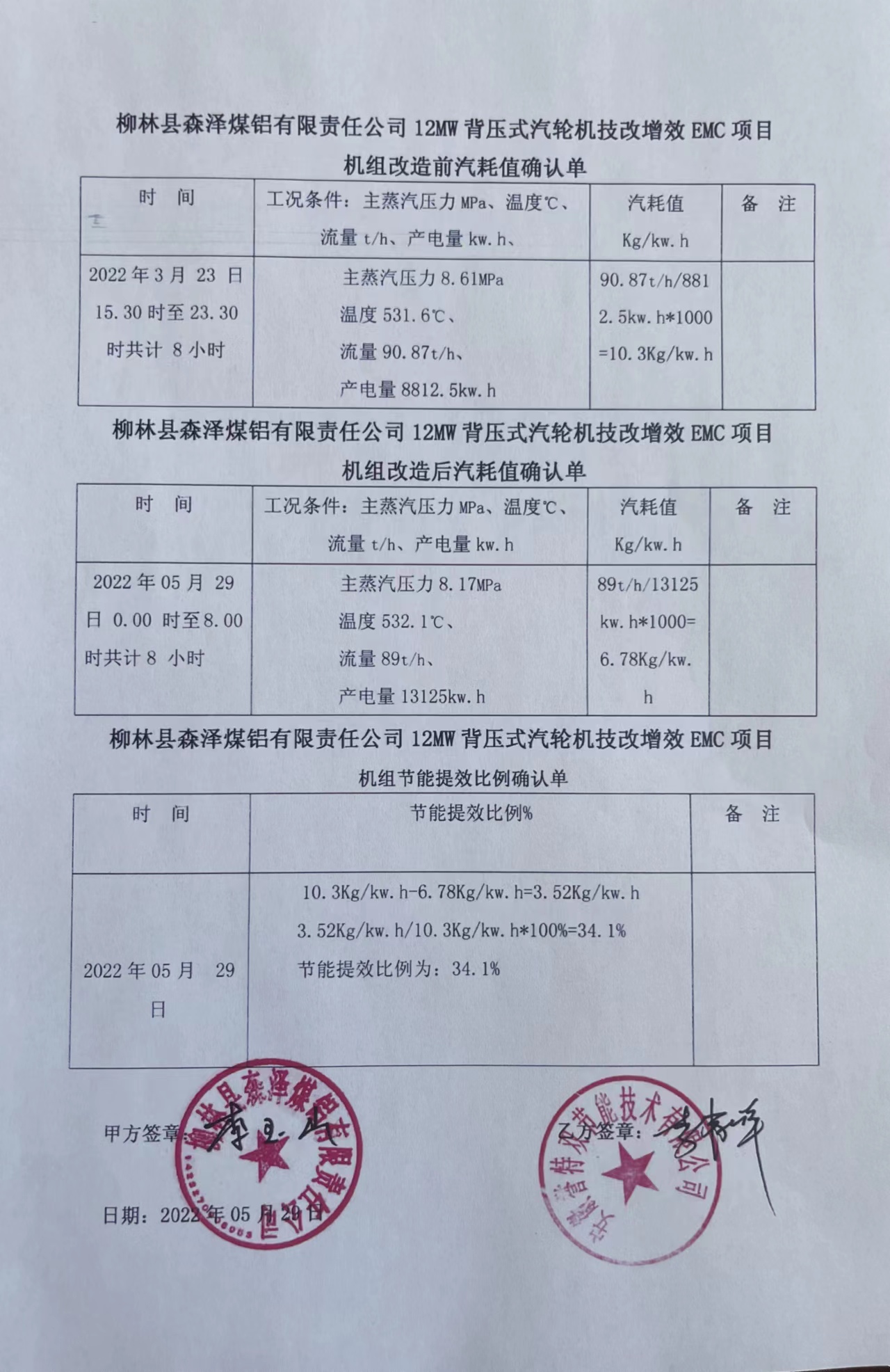 山西森澤煤鋁集團12MW背壓1#機組節(jié)能技改提效合同能源管理項目順利通過工程驗收節(jié)能提效比例達34.1%遠超合同約定。