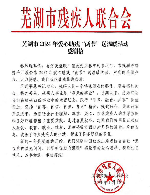 2024年1月18日,蕪湖市愛心助殘“兩節(jié)”送溫暖活動啟動大會舉行,全市數(shù)10家商協(xié)會及部分愛心單位,市殘聯(lián)五大協(xié)會以及困難殘疾人代表參加儀式,為全市各縣市區(qū)的100名困難重度殘疾人及其家庭現(xiàn)場送溫暖,與困難殘疾人共度寒冬。會后,市殘聯(lián)為各商協(xié)會及愛心企業(yè)送來感謝信,對愛心企業(yè)的捐贈表示衷心感謝!