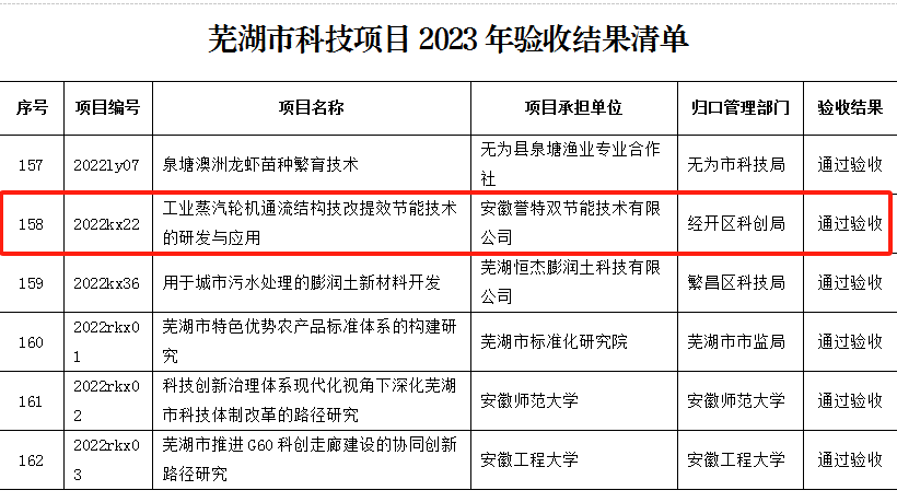 2024年2月22日,蕪湖市科學(xué)技術(shù)局發(fā)布《關(guān)于蕪湖市科技項(xiàng)目2023年驗(yàn)收結(jié)果的通報(bào)》,我公司項(xiàng)目——工業(yè)蒸汽輪機(jī)通流結(jié)構(gòu)技改提效節(jié)能技術(shù)的研發(fā)與應(yīng)用順利通過(guò)驗(yàn)收!