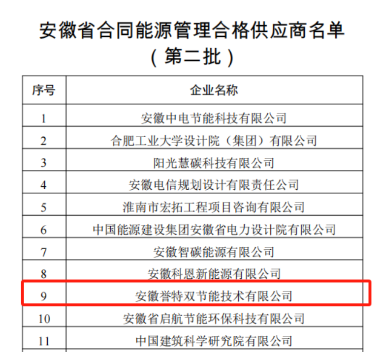 近日,安徽省發(fā)改委發(fā)布第二批安徽省節(jié)能減煤降碳診斷服務(wù)機(jī)構(gòu)和合同能源管理合格供應(yīng)商名單,本次節(jié)能減煤降碳診斷服務(wù)機(jī)構(gòu)共計(jì)擇優(yōu)評(píng)選出29家企業(yè),合同能源管理合格供應(yīng)商共計(jì)擇優(yōu)評(píng)選出14家企業(yè),我公司雙雙榮列榜單,在此表示熱烈祝賀。